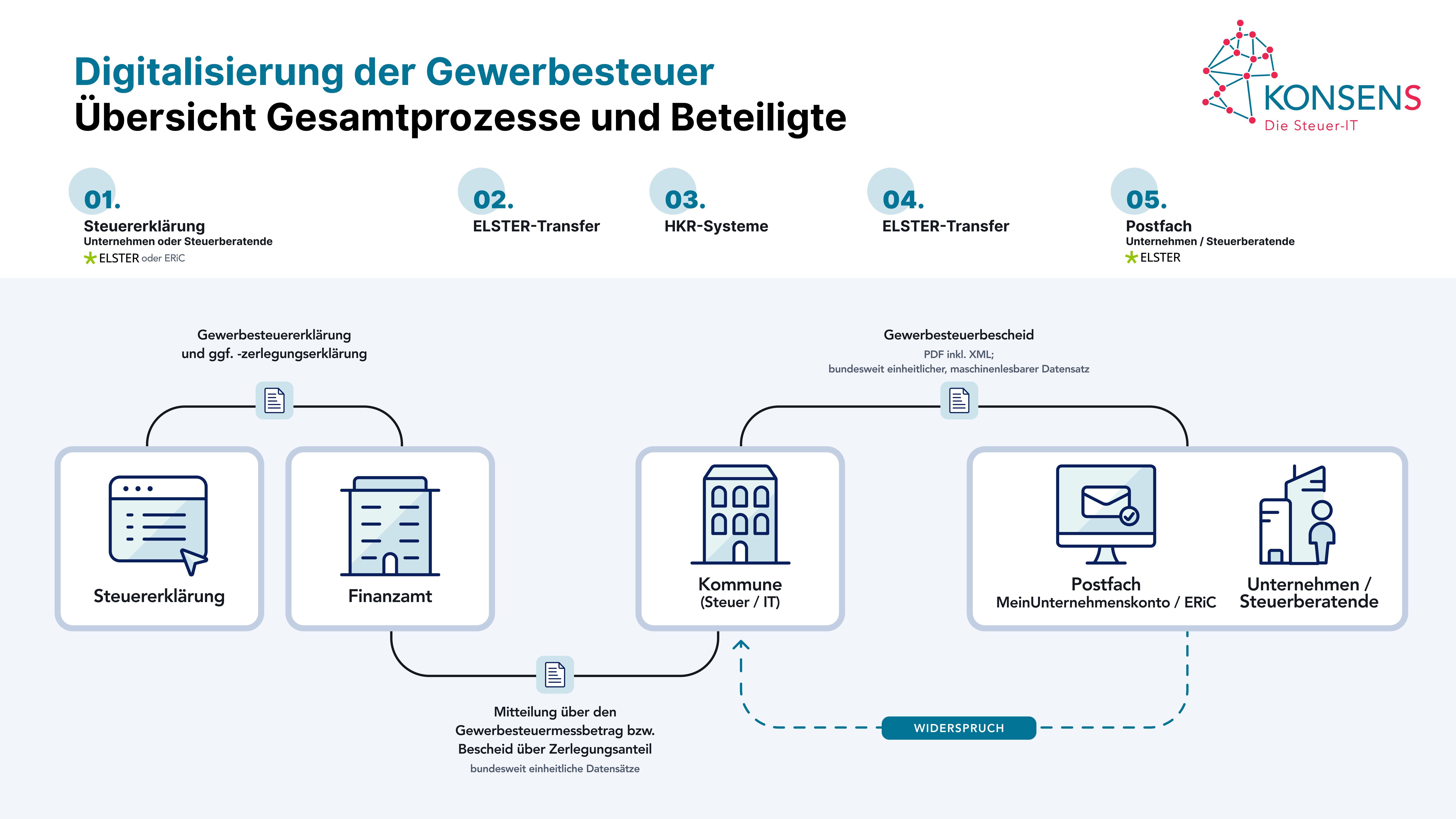 Er wird im Zuge des Onlinezugangsgesetzes (OZG) nach dem EfA-Prinzip (EfA= Einer für Alle) umgesetzt, bei dem ein Bundesland federführend die Leistung entwickelt und allen anderen zur Verfügung stellt. Es können sich also alle Kommunen an den digitalen Gewerbesteuerbescheid anschließen. Um den Erfolg sicherzustellen, ist es entscheidend, dass alle Kommunen zeitnah die technischen und organisatorischen Voraussetzungen für die Anbindung an die digitale Lösung schaffen.