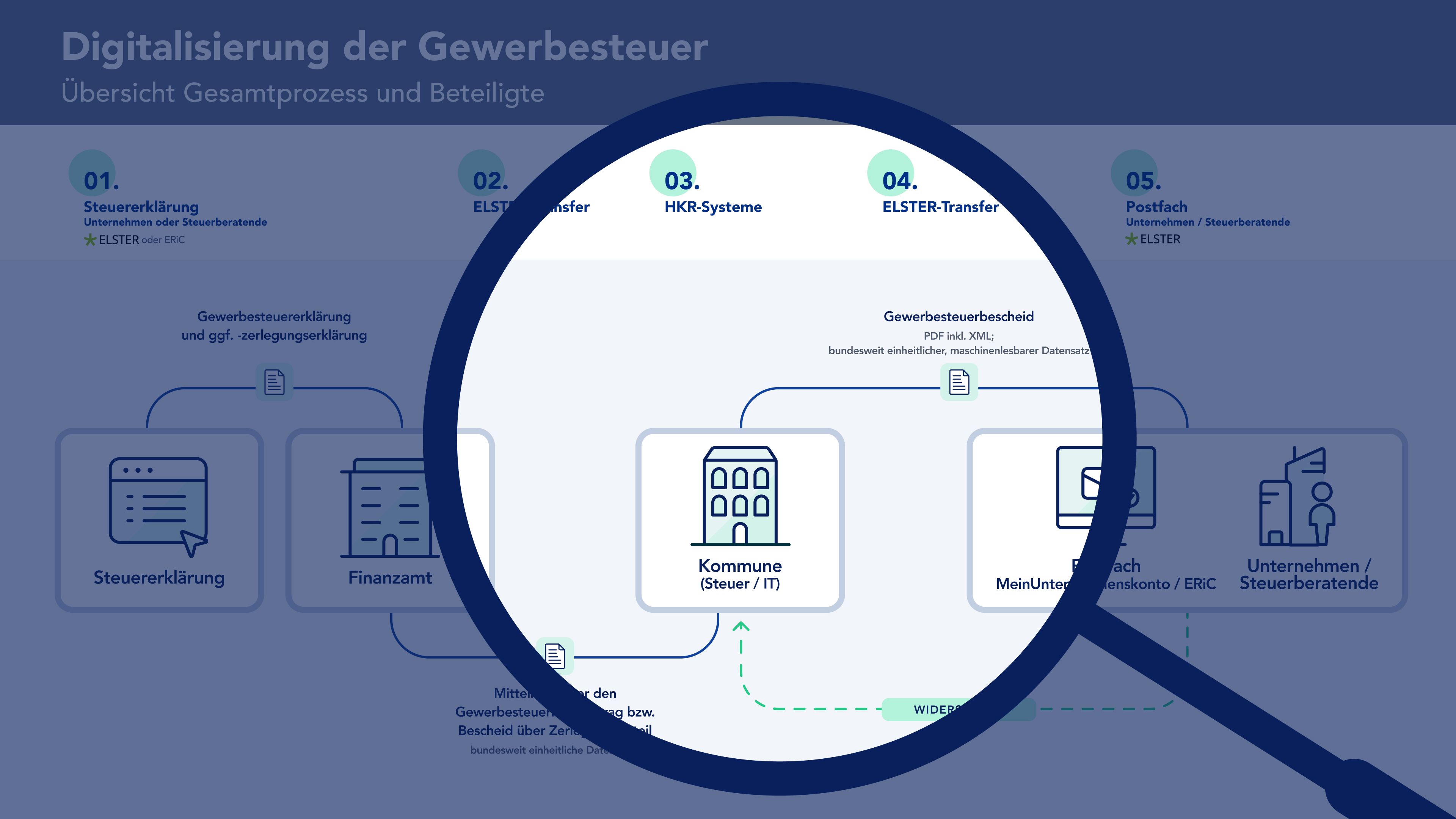 Für eine vollständige Digitalisierung der Gewerbesteuer müssen die Kommunen den digitalen Gewerbesteuerbescheids an die Unternehmen versenden können. Dabei sind sie vielfach auf Hersteller der HKR-Systeme angewiesen, die in Kommunen zur Erzeugung der Bescheide zum Einsatz kommen. Diese wiederum müssen ihre Software technisch auf Datenbank- und Applikationsebene anpassen und erweitern, um den digitalen Gewerbesteuerbescheid erzeugen zu können.